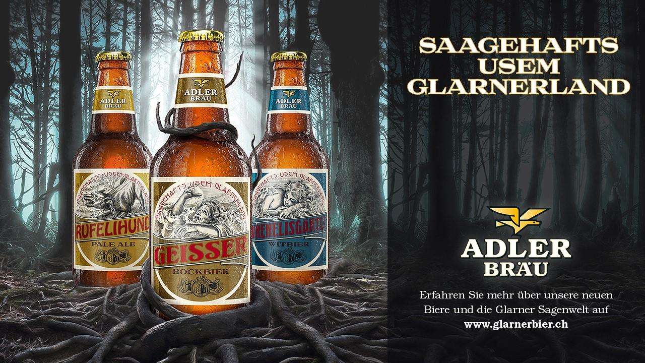 Unter dem Label «Saagehafts usem Glarnerland» hat Adler Bräu eine neue Produktelinie erschaffen. Als Namensgeber für die kultigen 29-cl-Flaschen dienen Glarner Sagen, die genau wie Adler Bräu seit jeher fest im Kanton Glarus verwurzelt sind. Dabei entstehen aussergewöhnliche Perlen der Braukunst, die das Sortiment der Brauerei Adler raffiniert ergänzen.