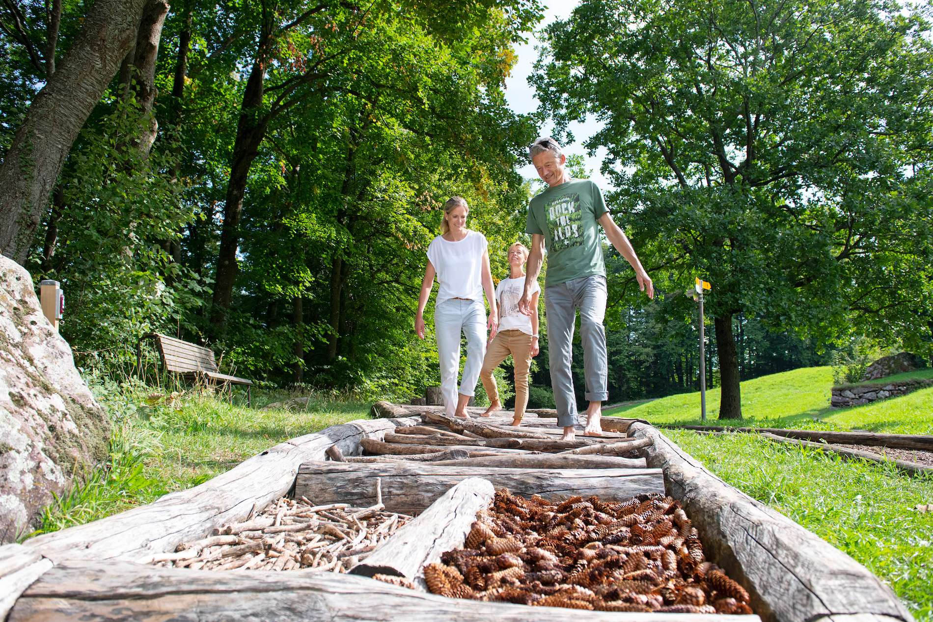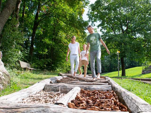 Schuhe und Socken weg und auf dem Barfussweg spüren, wie sich die unterschiedlichen Natur-Untergründe anfühlen. Falls man möchte, können dabei auch zur Abwechslung die Augen geschlossen werden.