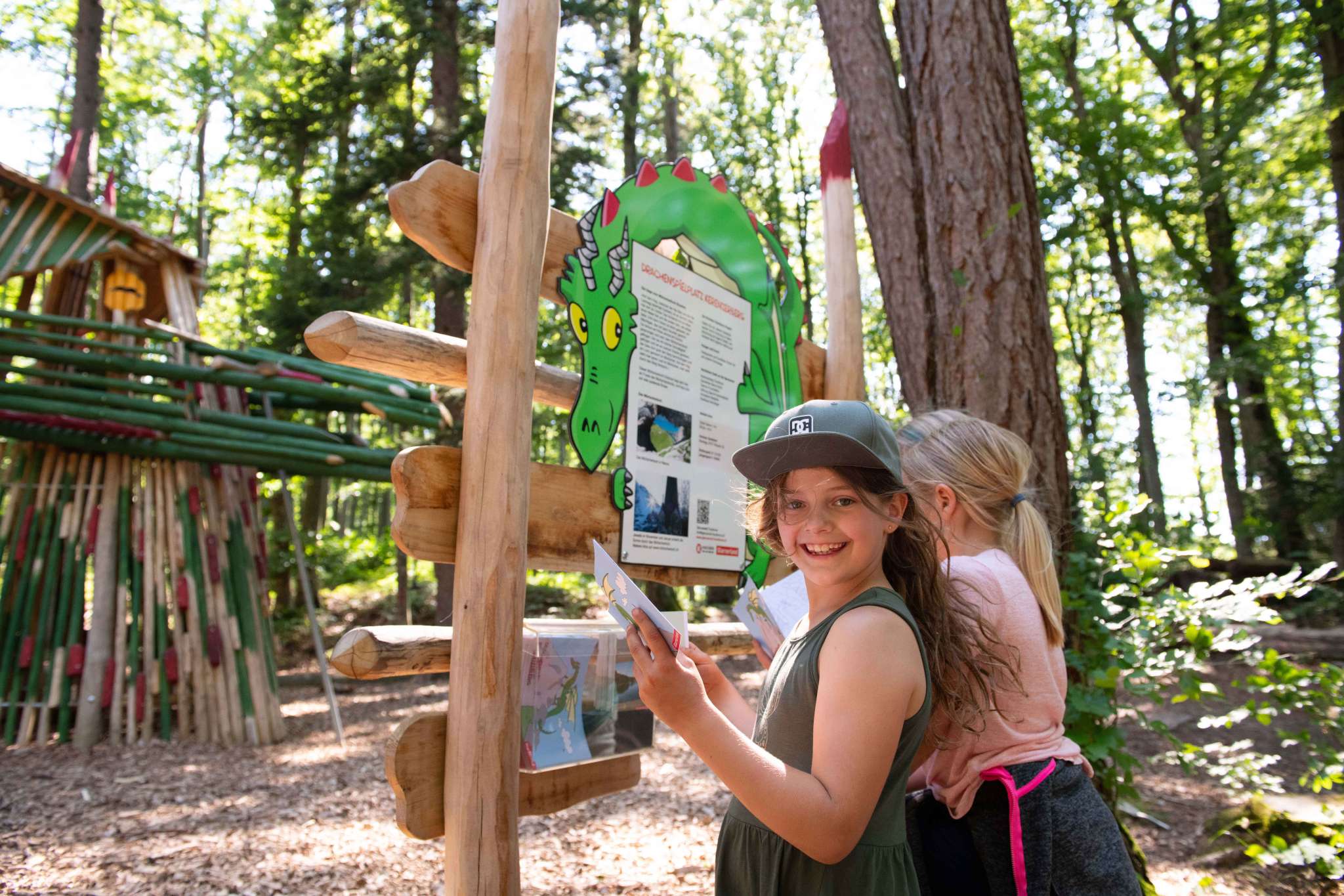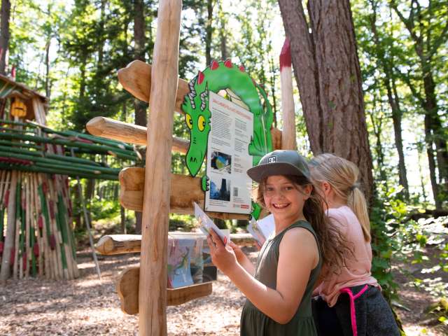 Im Reuteggwald wartet der Drache vom Mürtschenloch auf viele Kinder, die mit ihm spielen wollen. Für die Grossen gibt es verschiedene Sitzgelegenheiten.