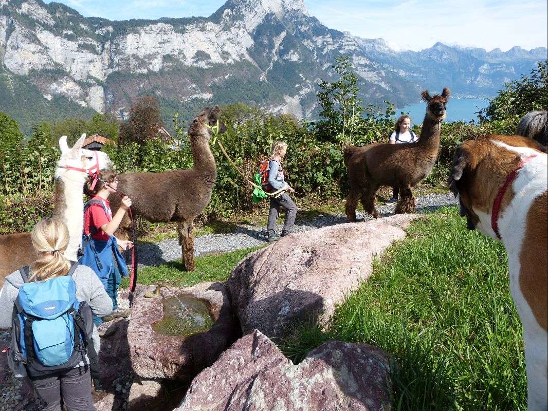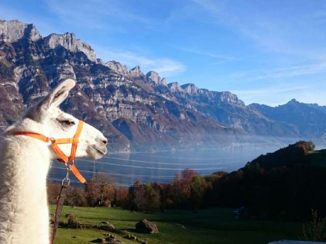 Lamas sind aufmerksam und intelligent. Ihr besonnenes und ruhiges Wesen macht sie auch für Kinder zum idealen Begleiter. Das gemütliche Tempo der Tiere und ihre Neugier veranlassen uns, die Umgebung auf eine andere Art wahrzunehmen. Wir starten die Touren auf unserem Hof. Dieser befindet sich im östlichsten Zipfel des Glarnerlands, hoch über dem Walensee. Schnuppertour Auf dem alten Römerweg wandern wir auf abwechslungsreichen Wegen nach Walenguflen. Über die Hängebrücke und durch das Felsentunnel in den Fuchsfallen geht es wieder zurück. Dauer: 1.5 bis 2 Stunden. Brätlitour Wir wandern über Walenguflen nach Obstalden. Danach geht es hoch über dem See weiter Richtung Filzbach. Im Rüteggwald bräteln wir eine Wurst oder kochen auf dem Feuer ein Fondue. Auf dem Rückweg geniessen wir die schöne Aussicht auf den Walensee. Dauer: ca. 6 Std, Wanderzeit 3 Std. Beizlitour Über den Römerweg wandern wir nach Filzbach ins Restaurant Panorama Lihn. An herrlicher Aussichtslage über dem Walensee lassen wir uns dort verwöhnen. Zurück geht es über den Gugger ins Mittlisor. Bei Walenguflen wandern wir über die Fuchsfallen mit ihrer Hängebrücke wieder zurück zum Hof. Dauer: ca. 6 Std., Wanderzeit 4 Std.