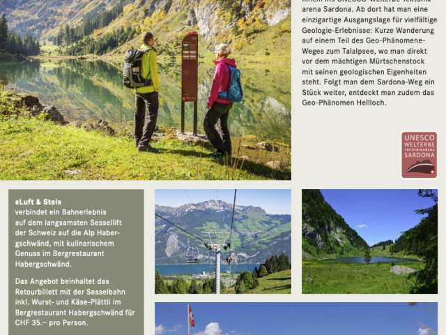 Das Angebot beinhaltet das Retourbillett mit der Sesselbahn inkl. Wurst- und Käse-Plättli im Bergrestaurant Habergschwänd für CHF 40.00 pro Person. Nur an der Talstation der Kerenzerbergbahn erhältlich. Auf dem Zweier-Sessellift geht es in 20 Minuten hoch durchs Walensee-Tor hinein ins ­UNESCO-Welterbe Tektonikarena Sardona. Ab dort hat man eine einzigartige Ausgangslage für vielfältige Geologie-Erlebnisse: Kurze Wanderung auf einem Teil des Geo-Phänomene-Weges zum Talalpsee, wo man direkt vor dem mächtigen Mürtschenstock mit seinen geologischen Eigenheiten steht. Folgt man dem Sardona-Weg ein Stück weiter, entdeckt man zudem das Geo-Phänomen Hellloch.