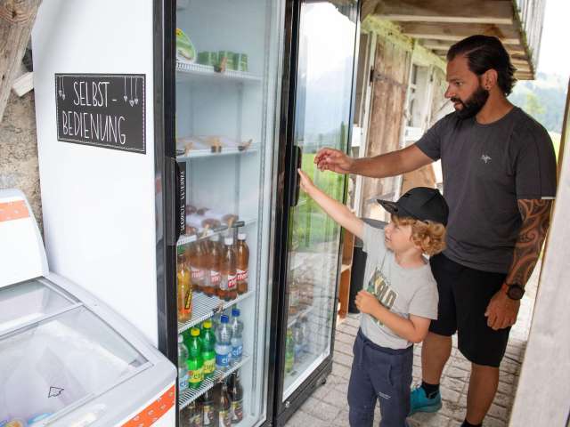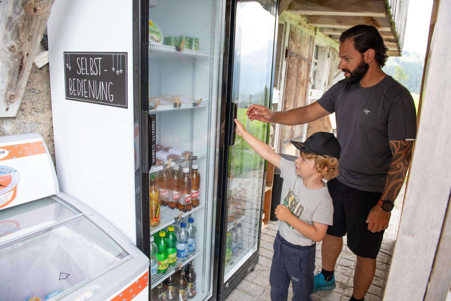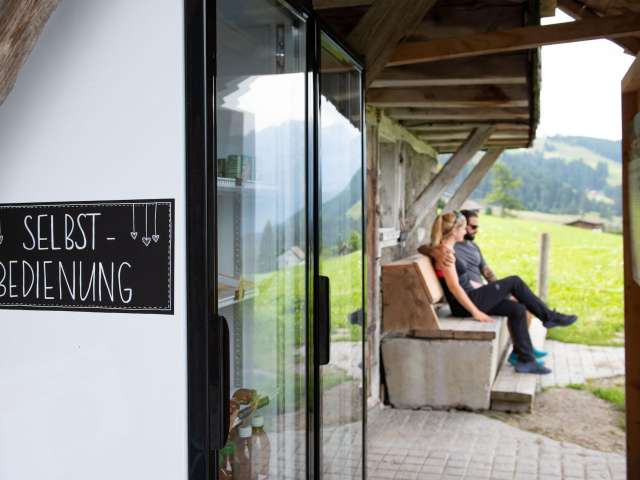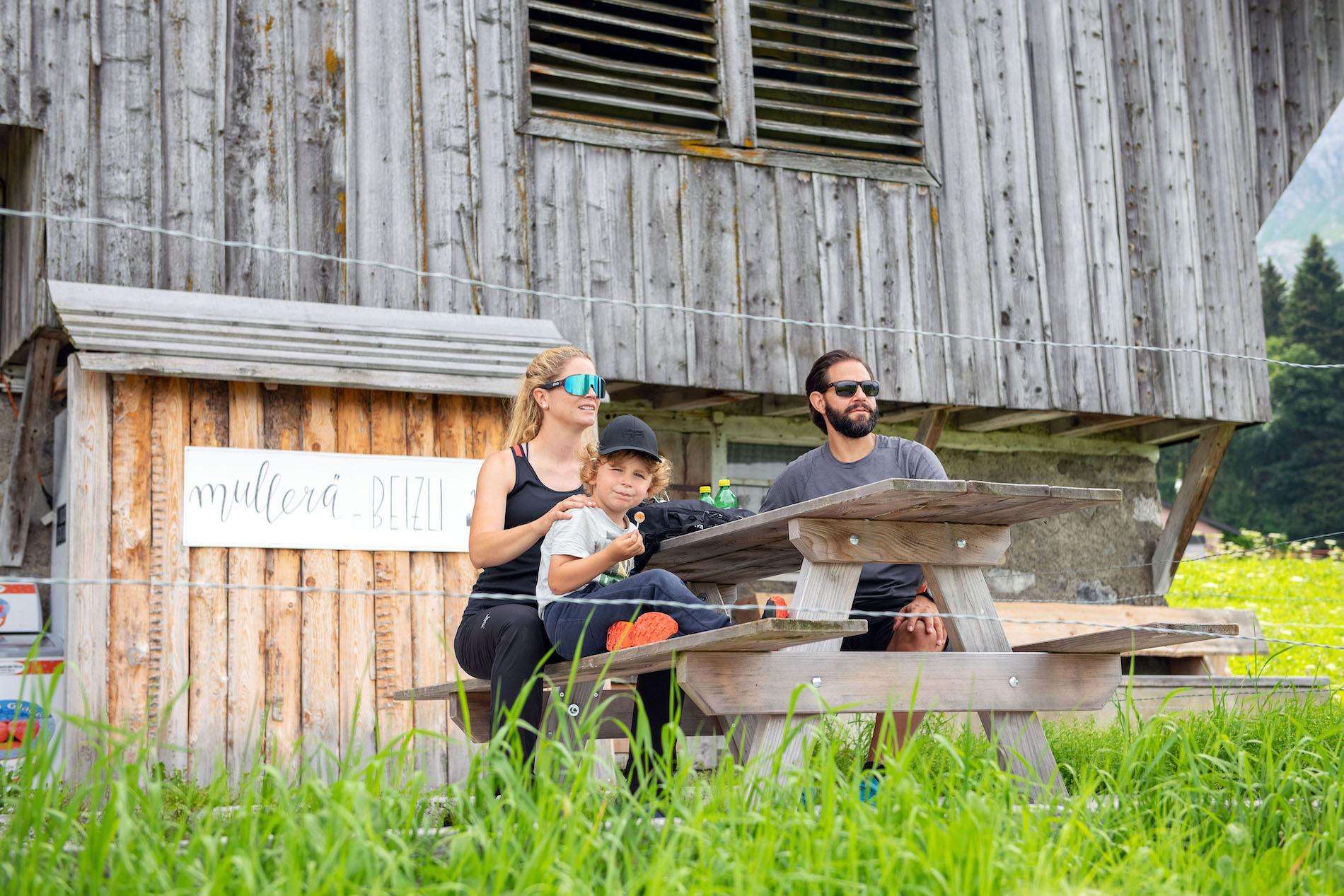 Das Mullerä-Beizli beinhaltet eine gemütliche Sitzgelegenheit sowie zwei Gastrokühlschränke. Sie sind gefüllt mit Getränken und Snacks wie beispielsweise feinen Kuchen und Zutaten fürs Plättli. Das Angebot basiert auf Selbstbedienung und ist für Wanderer, Biker und Tagestouristen frei zugänglich.
