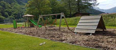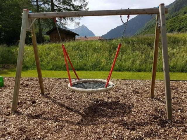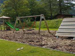 Auf der grossen Wiese können sich die Kinder im Klettern üben, vom Rutschturm über die Rutsche zurück auf den mit Sägespänen ausgelegten Boden und auf dem Vogelnest in der Luft schwingen. Auch Brennholz und ein Picknicktisch stehen zur Verfügung.